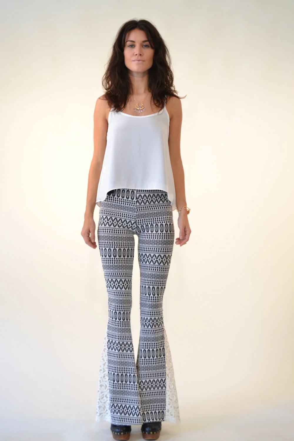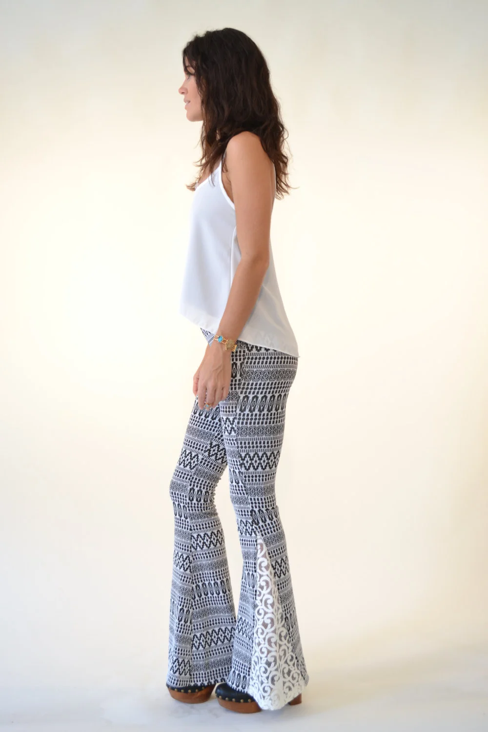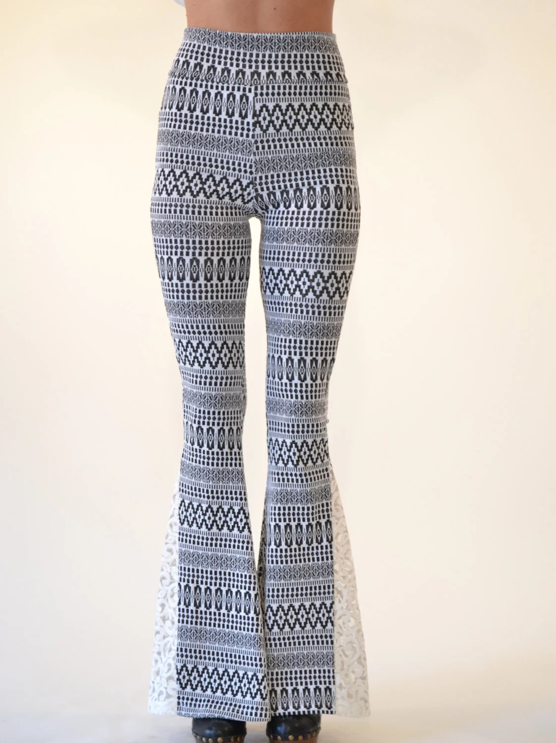 Our Juno Bells are the perfect festival/dance/lounge pants! Wear them either high waisted or hip hugger with our fold over waistband. The Lace detail adds a funky twist on the already popular bell bottom style