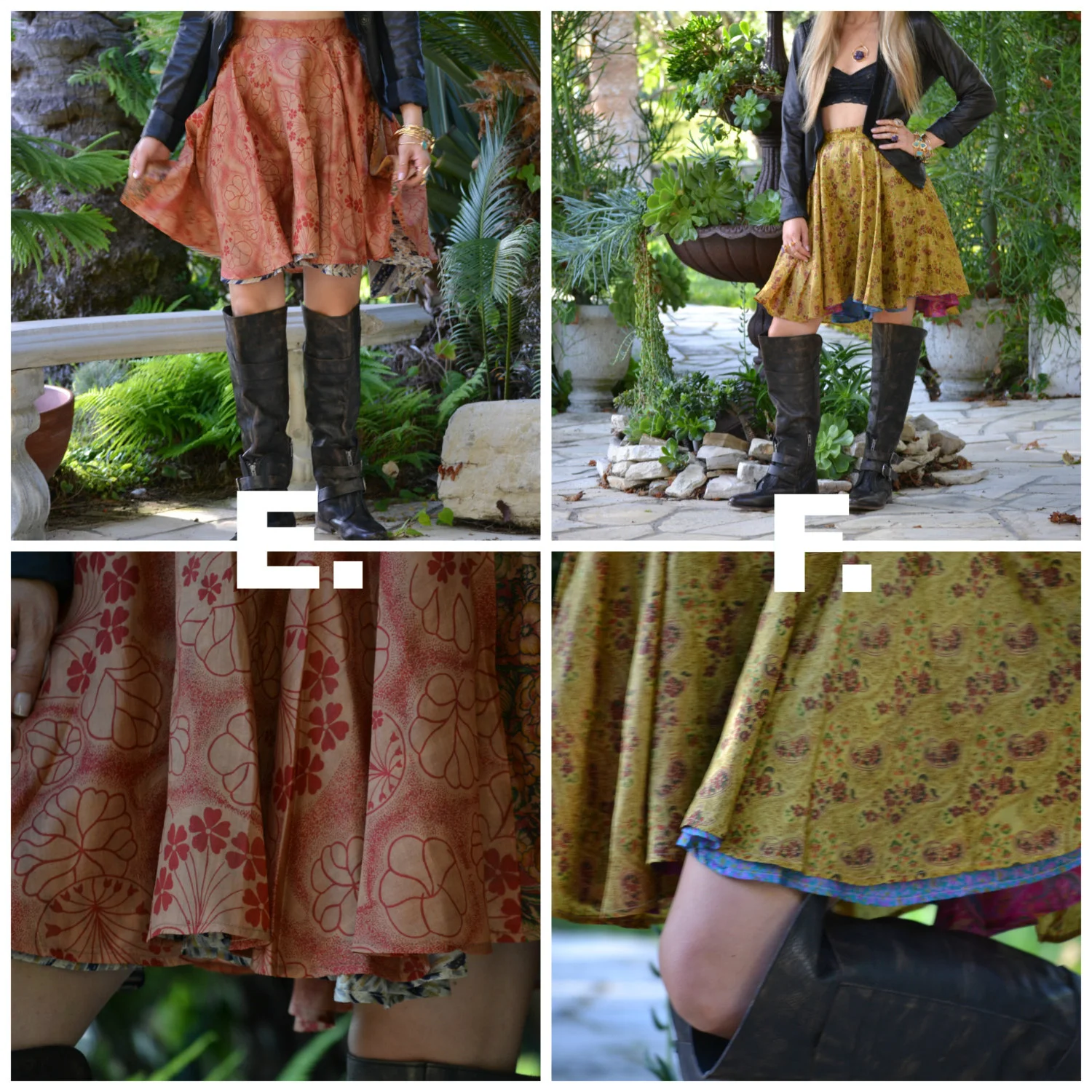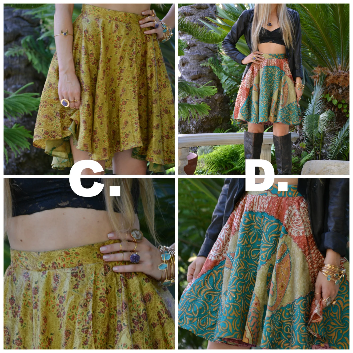 These skirts are made from two layers of vintage silks, two different prints. They can be worn on either side making them reversible! Each skirt is one of a kind, no two are the same. They are made from vintage silk saree's from India. Each saree is hand selected. Handmade in Los Angeles, Ca from start to finish in an small ethical factory.